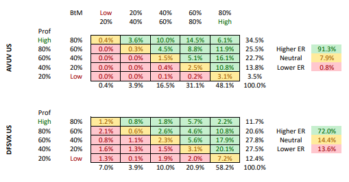 - Value funds: For funds that are labelled as ‘Value’, DFA primarily targets Value using B/M as a proxy, while Avantis uses joint adjusted B/M and profitability at a roughly equal split. Avantis published their own research conducted by Wahal and Repetto on why they believe joint value and profitability are superior, first using US data in their 2020 paper and then international data in their 2021 paper. This difference in methodology means that DFA would have a higher exposure to Value while Avantis would have a higher exposure to Profitability. To give a visual on how DFA and Avantis approach Value funds differently, Luke_Swanson made this comment in the Rational Reminder Community, sharing an email they received from Avantis analysing the company composition broken down by Value and Profitability between their Avantis US Small Cap Value ETF (AVUV) vs DFA’s US Small Cap Fund (DFSVX).