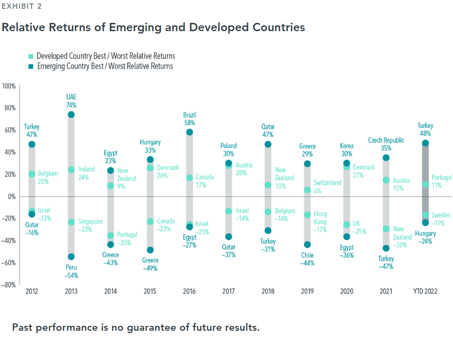 It is because of these risks that emerging markets have historically had more severe drawdowns compared to developed markets. For the countries within emerging markets, they tend to be more susceptible to catastrophic losses, extreme volatility, or poor return/risk. This can be alleviated by being broadly diversified across all emerging markets (Beach, 2006; Estrada, 2008).
