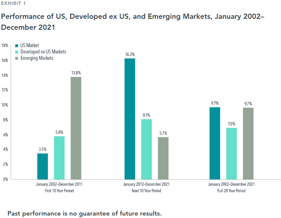 Emerging markets provide lower correlation from not being fully integrated into the global market (Beach, 2006; Camilleri and Galea, 2009; Gupta et al., 2017). This is evident when looking at the last couple decades of performance, where the below chart from DFA shows emerging markets outperforming in the 2000s but underperforming in the next decade.