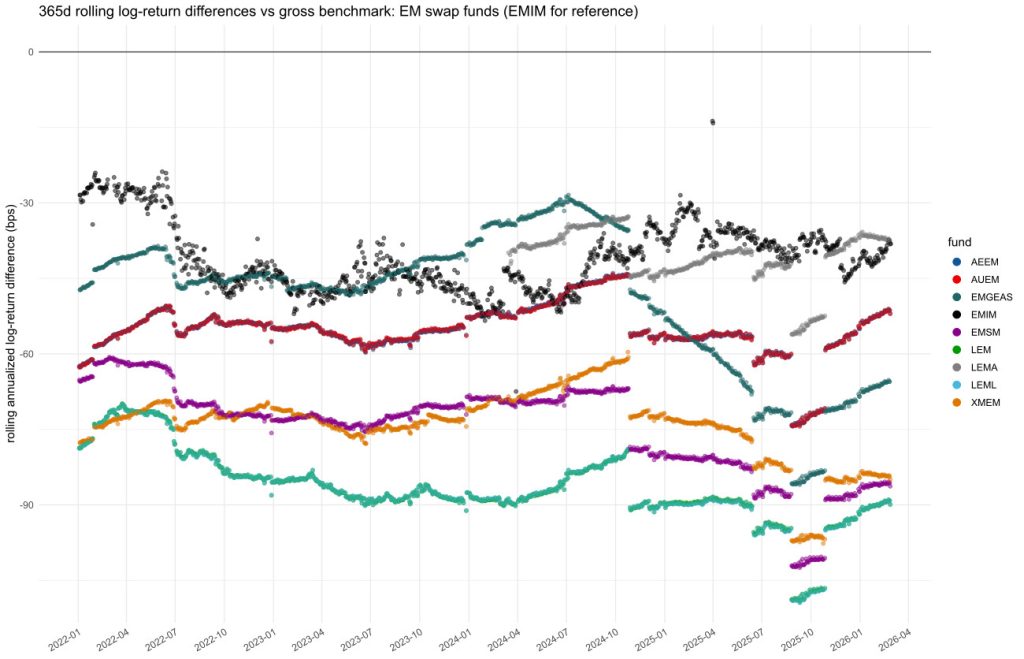 - Rational Reminder user glimz started the following thread Comparing index-replicating UCITS ETFs. They included the below image comparing synthetic emerging market ETFs from January 2022 to February 2026, showing LEMA (the ETF that BEMG holds) having one of the lowest tracking differences, as represented by the grey dots. EMIM, the black dots, is a physical replicating ETF shown as a reference.