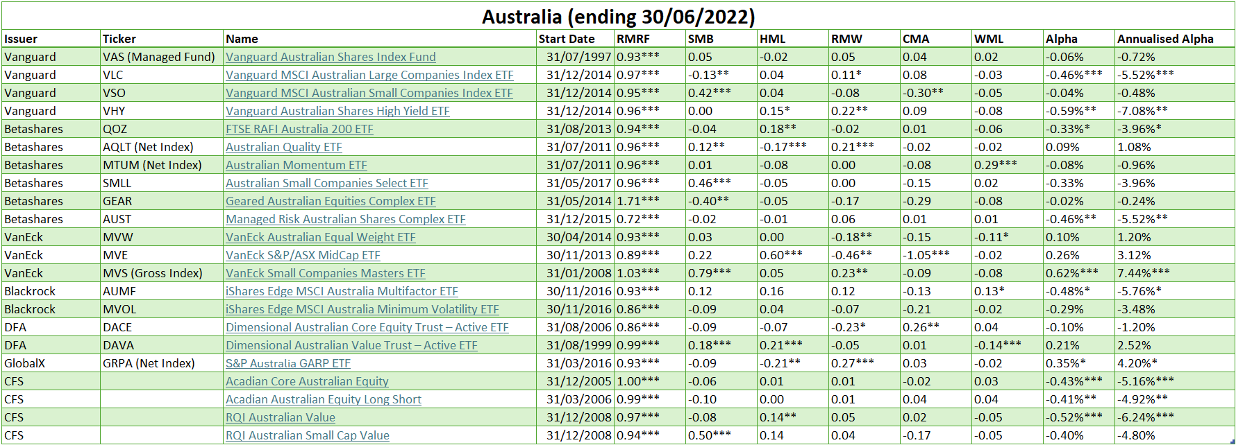 Factor regressions are used to estimate which factors drive a portfolio’s returns and by how much. Given there is no tool for Australians to calculate the factor regression of Australian-domiciled funds, I learnt to (hopefully correctly) calculate monthly factor regressions and have applied them to funds that I thought would be most interesting. Global Factor Premia is used to get Australian factor data while Fama French Data Library is used to get International and Emerging Markets data.