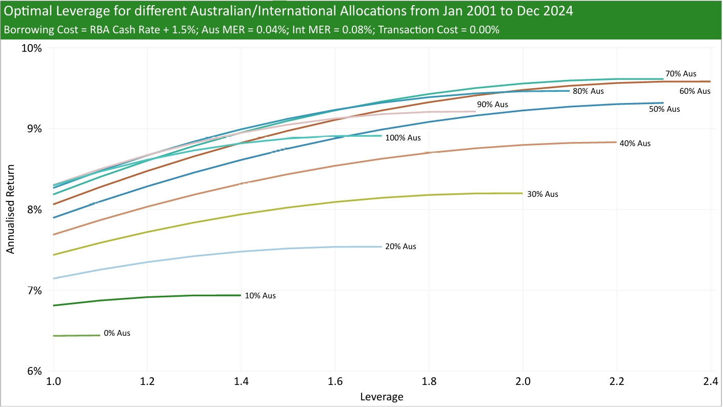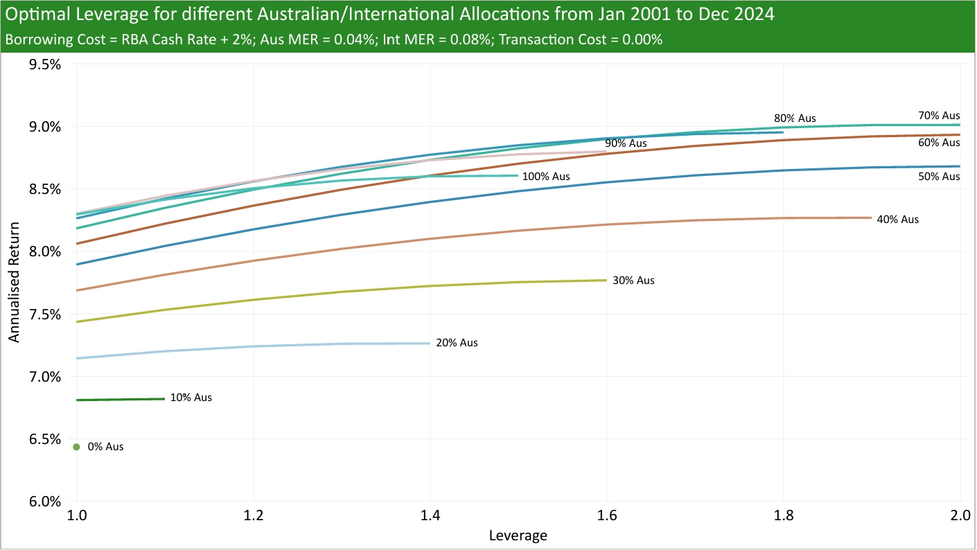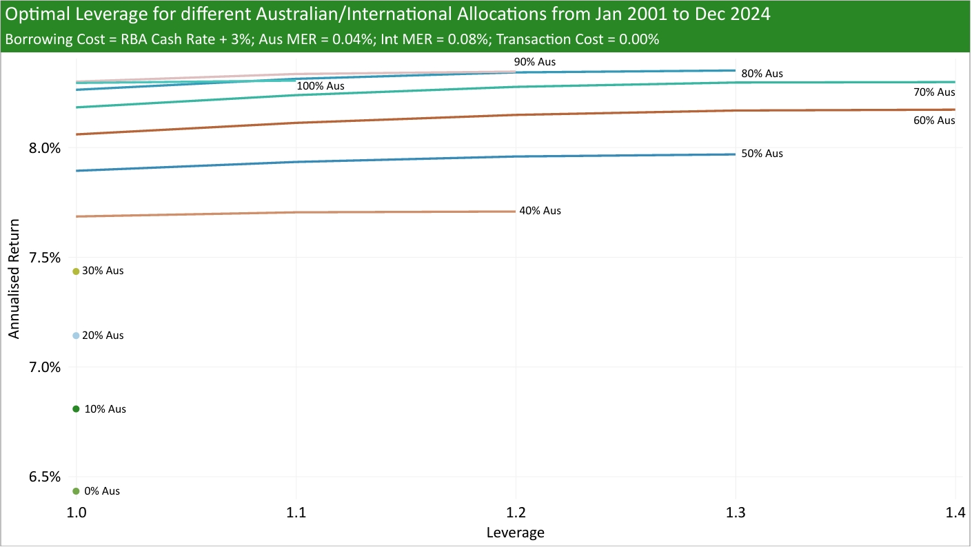 I try to answer this question by using historical Australian and International returns (MSCI Australia IMI and MSCI ACWI ex-Australia, respectively), historical RBA cash rates, added a range of borrowing spreads (borrowing rate minus RBA cash rate), and tested different MERs and transaction costs to see what was the historical optimal leverage from Jan 2001 to Dec 2024.