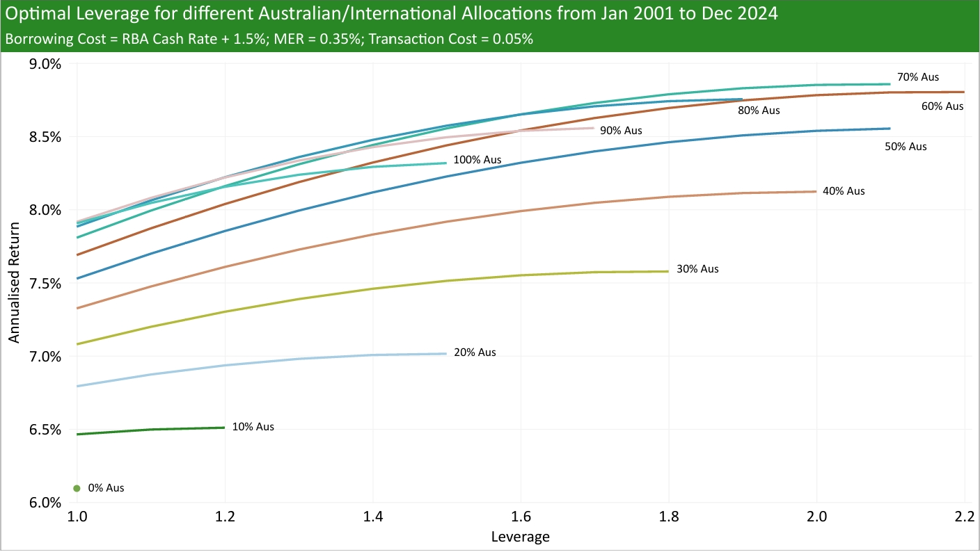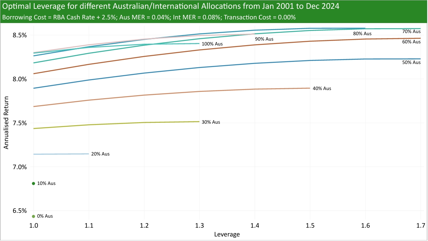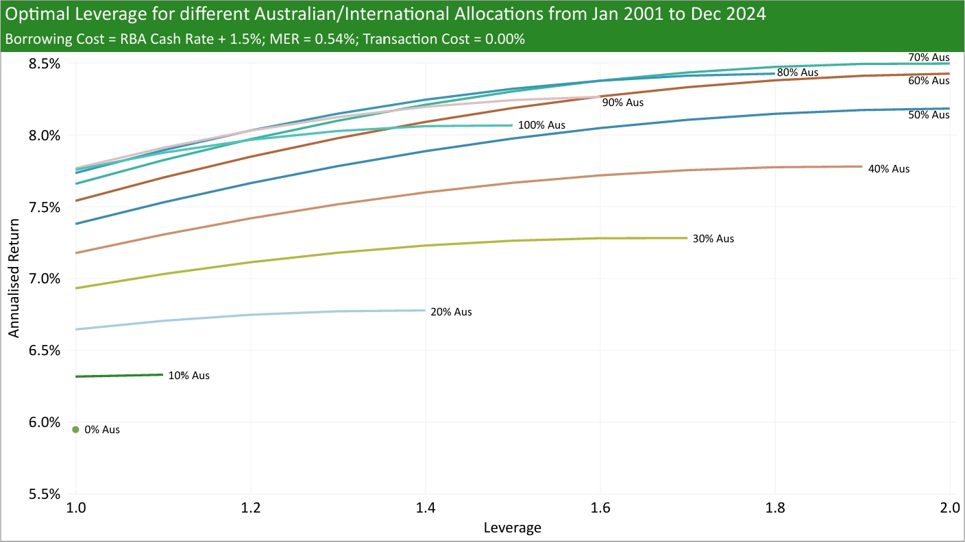 I try to answer this question by using historical Australian and International returns (MSCI Australia IMI and MSCI ACWI ex-Australia, respectively), historical RBA cash rates, added a range of borrowing spreads (borrowing rate minus RBA cash rate), and tested different MERs and transaction costs to see what was the historical optimal leverage from Jan 2001 to Dec 2024.