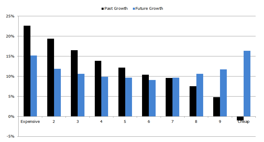 For example, as mentioned previously, growth companies historically had lower returns. One of the reasons for this is because these companies had high past earnings growth. Investors then extrapolate this past growth into the future, but these investors fail to consider mean reversion of earnings growth. This is illustrated in the below chart made by Wesley Gray, where the far left are growth/expensive companies, as evident by having the highest past growth in earnings. However, their subsequent future growth diminishes as earnings growth reverts to the mean. On the opposite side, value/cheap companies had poor past earnings growth but future growth rebounds. So growth companies and their high past earnings growth can be a trap for investors who do not realise that this generally indicates lower expected returns.