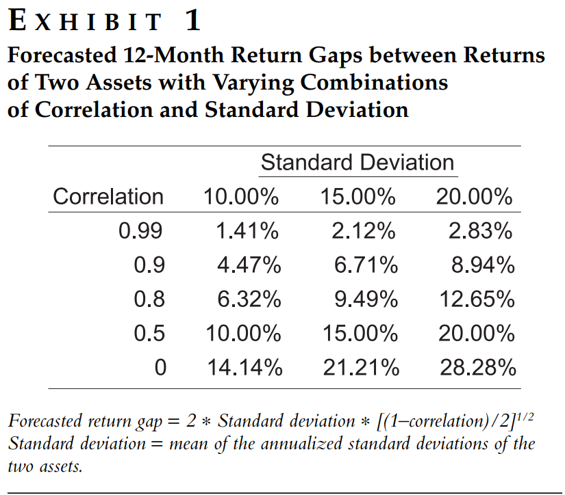 The authors theoretically show this in the below table, where they use the return gap to measure diversification, taking both correlation and standard deviation into account. The higher the return gap, the greater the diversification benefit. For example, two assets with a 20% standard deviation and a 0.8 correlation would provide better diversification than if the standard deviation was 10% with a 0.5 correlation, despite the former having a higher correlation.